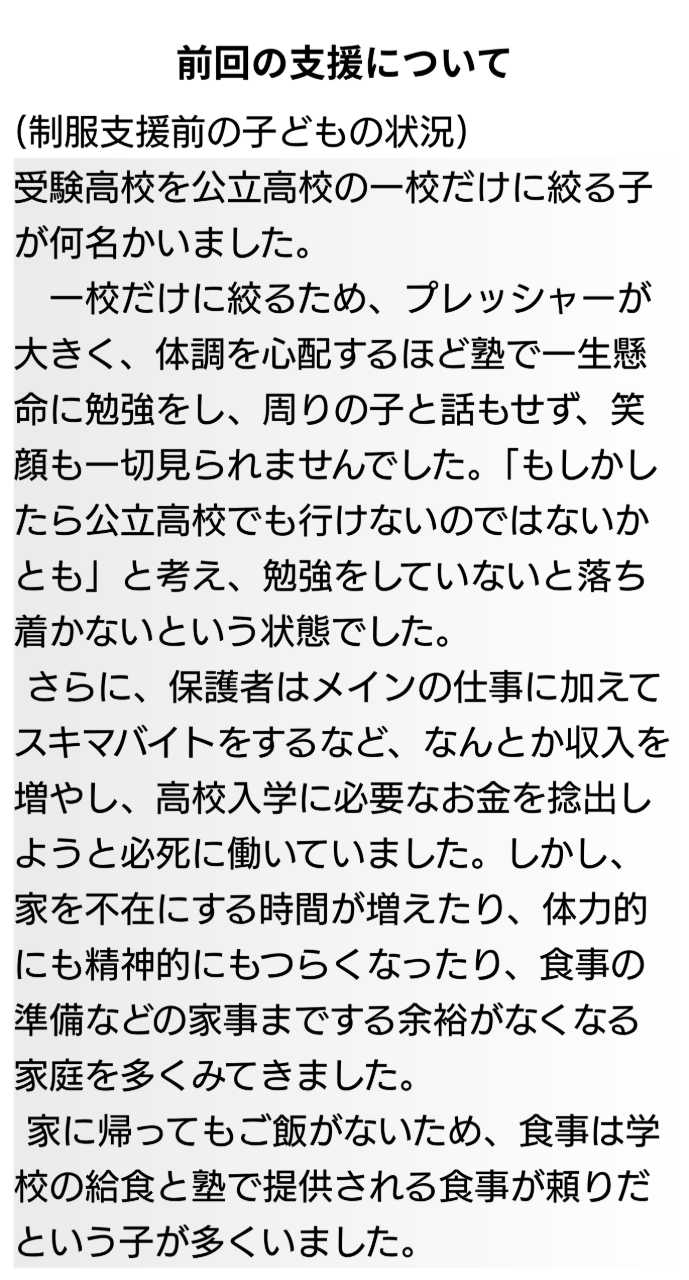 10年以上支援をしていくなかで、学力や目標があるにも関わらず、経済的理由により高校進学を諦める子ども達を何人も見てきました。
