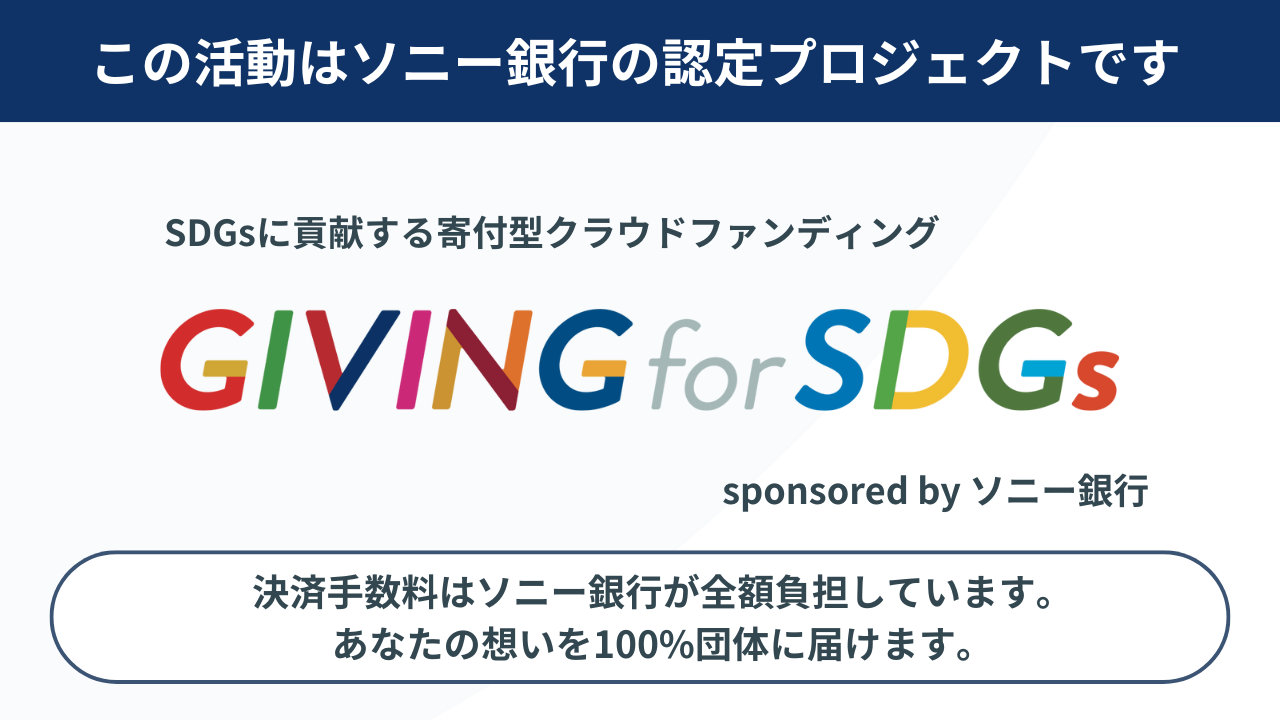 このプロジェクトは「GIVING for SDGs sponsored by ソニー銀行」の認定プロジェクトです。「GIVING for SDGs sponsored by ソニー銀行」では、寄付決済時に発生する決済手数料をソニー銀行が協賛することで、寄付者の想いがこもった大切な寄付金を全額 NPOに届けます。寄付金の社会への還元性を高めることで、寄付文化の浸透および NPOの社会課題解決に向けた活動を支援することが可能です。