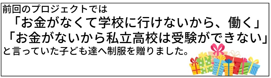 今回も新しい制服を贈ることで夢に向かって頑張っている子どもたちにエールを送ってください!