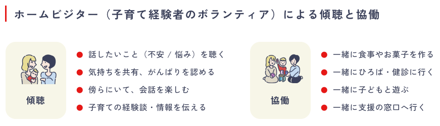 家庭訪問型の子育て支援「ホームスタート」は、研修を受けた子育て経験のある地域のボランティア(ホームビジター)が家庭を訪問し、親の気持ちに寄り添いながら、一緒に子どもと過ごす活動です。