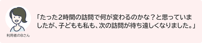 ボランティア(ホームビジター)と一緒に公園に遊びに行ったり、買い物や病院、子育て支援の施設などに同行することで、社会との接点が自然と増えていった家族の例などもたくさんあります。