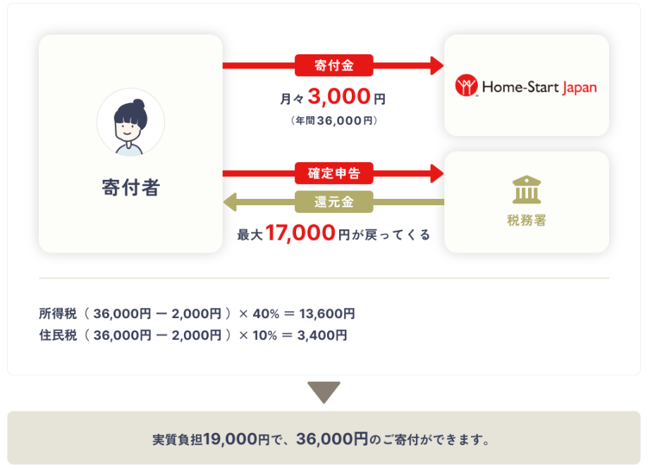 ホームスタート・ジャパンへのご寄付は、寄付金控除(税制優遇)の対象となり、最大50%が戻ってきます。