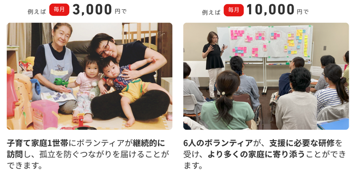 きちんと仕組みを持ち、多数のスキルアップの機会を設けてホームビジターを育成することは素晴らしいですが、相応のコストもかかります。「どこかの子育て家庭を少し支援する」そんな気持ちでご支援させて頂いています。