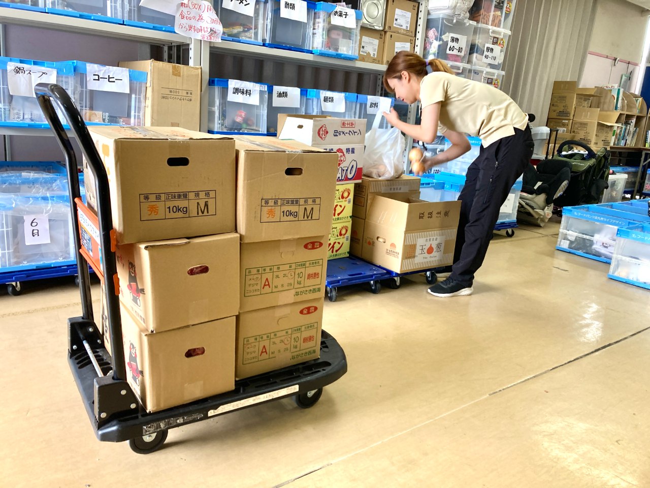 現在、私たちがつながり支援している継続食料支援世帯は150世帯から170世帯の子育て世帯。継続期間は3ヶ月から6ヶ月、時には12ヶ月に渡ることもあります。家族人数に合わせた食材を用意し、可能な限り受け取りに来ていただいています。受け取り時が、コミュニケーションできる機会ととらえ、スタッフは傾聴に心がけています。おしゃべりの中から食料支援とは別の支援が必要だと気づいた場合は、行政や専門機関と連携して支援につなぎます。