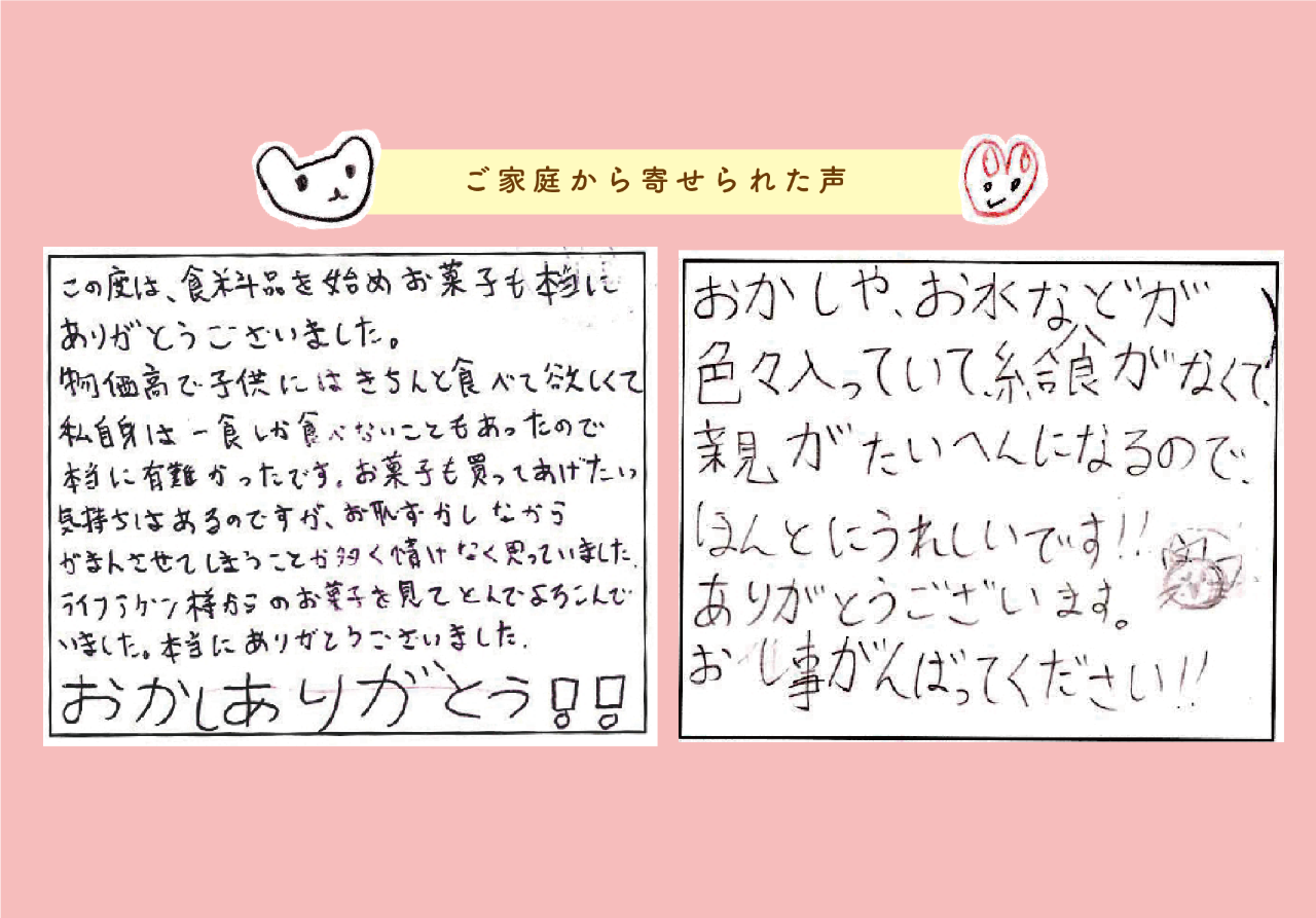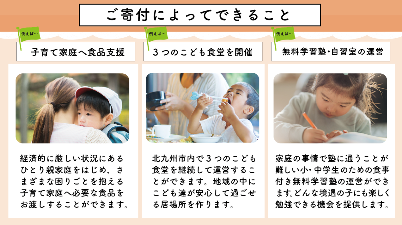 みなさまからいただいたご寄付は、こどもたちを支援する活動費とともに、その親子への支援に必要な食料を確保・保管・配送し、行き渡らせるためのフードバンクシステム構築にあてます。また、運営を安定させ、人材確保し、継続的に見守れるよう組織基盤を強化するためにも活用させていただきます。