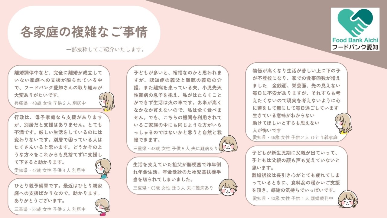 子どもの貧困やひとり親家庭の孤立、ヤングケアラーなど、現代のこどもたちを取り巻く機会格差は大きな社会問題です。生活の為に食費や生活用品を切り詰めている家庭の声を多く聞くようになり、こども達の生活環境の悪化に危機感を覚えました。「困っている子どもたちに、家庭に、私たちが出来ることはないだろうか。世の中の『困った』を少しでも減らせる活動がしたい。」という思いに共感する仲間(ボランティア、企業、行政)が集まり、『フードバンク愛知』を設立しました。フードロスを有効に活用したフードバンク事業を通じ、支援を必要とする家庭や団体の力になれるよう日々活動しています。