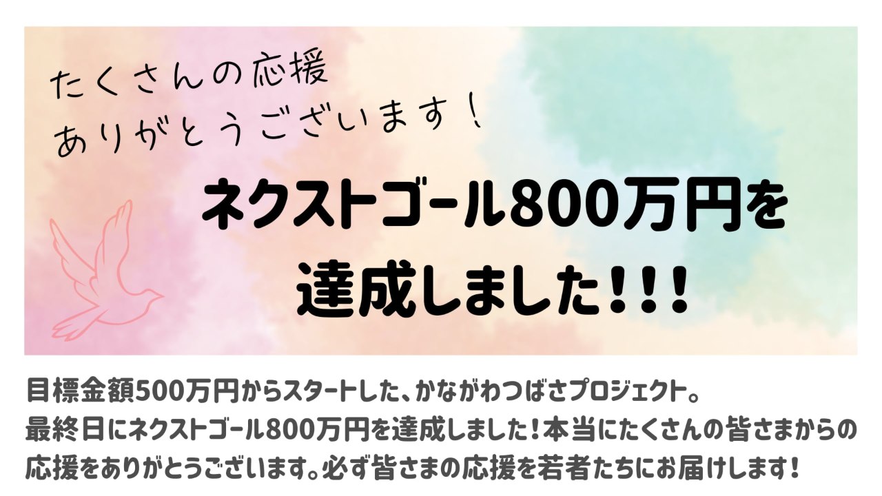 まだまだクラファンは終わりません!この先来年・再来年とつばさプロジェクトを継続できるように、ネクストゴールを800万円に設定しました。