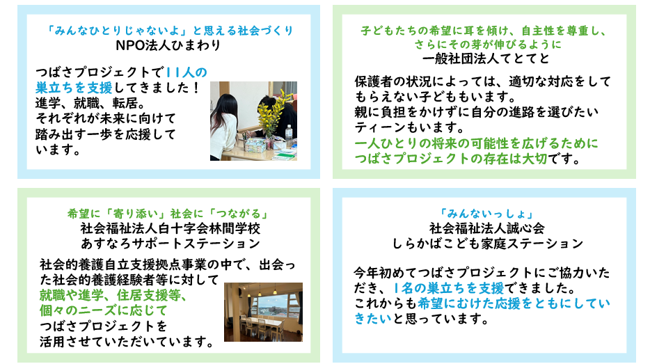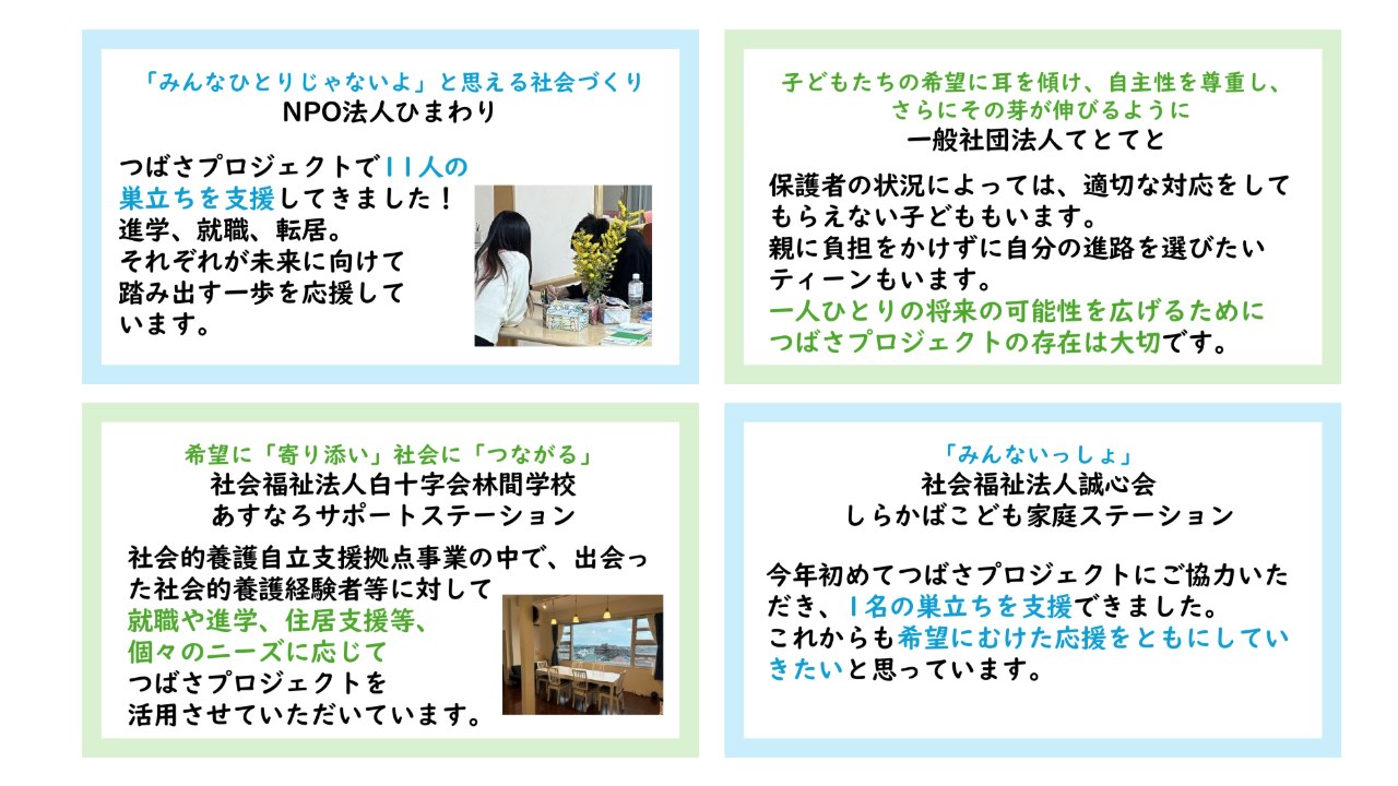 つばさプロジェクトでは、これまで延べ46団体と協力して若者の巣立ちを応援してきました。日々若者たちに伴走しているNPO・団体のスタッフの声をご紹介します。